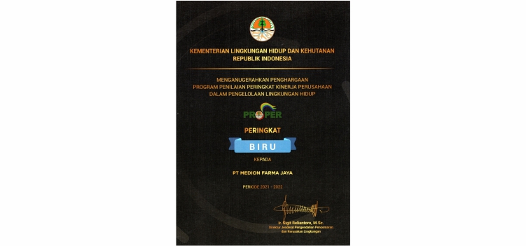 PT Medion Farma Jaya sebagai salah satu peserta PROPER 2022 kembali meraih peringkat biru. Ini merupakan penghargaan ke-4 yang berhasil diraih setelah sebelumnya mendapat peringkat yang sama untuk periode tahun 2018, 2019, dan 2021. Dalam acara penganugerahan PROPER 2022, wakil Presiden RI, K. H. Ma’ruf Amin menyampaikan harapannya agar semakin banyak perusahaan yang menjadi agen perubahan dalam menjaga kelestarian lingkungan hidup.