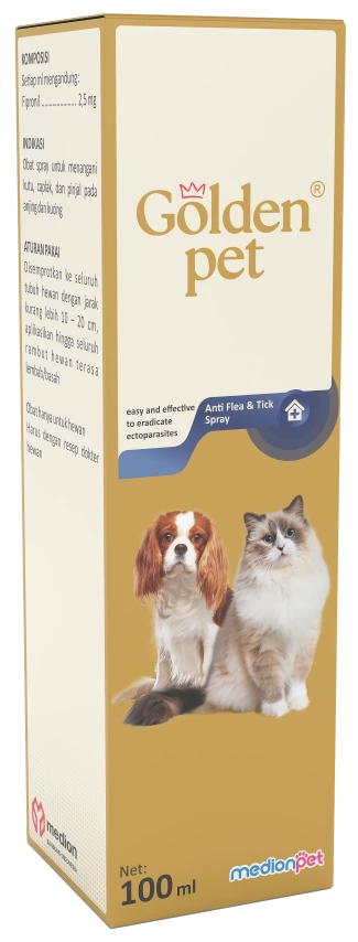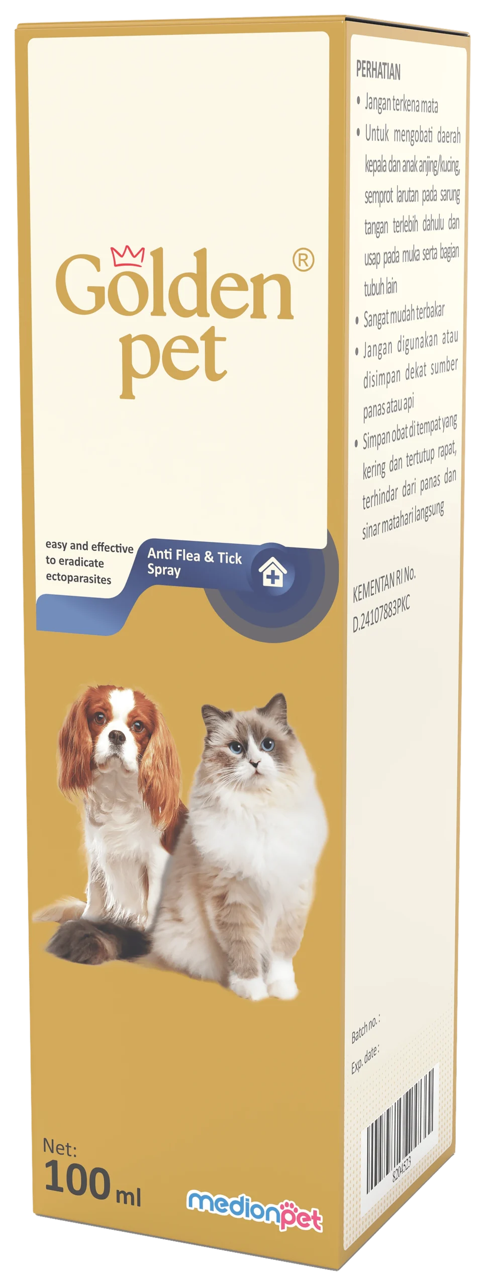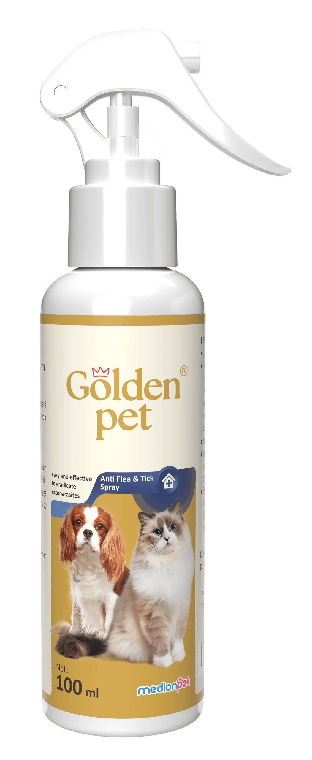 GOLDEN PET ANTI FLEA & TICK SPRAY is a spray preparation for topical use containing the antiparasites fipronil. Fipronil has a broad spectrum and works by blocking parasite receptors that depend on gamma-aminobutyric acid (GABA), as well as disrupting nerve transmission, which ultimately causes akinesia and death of the parasite.