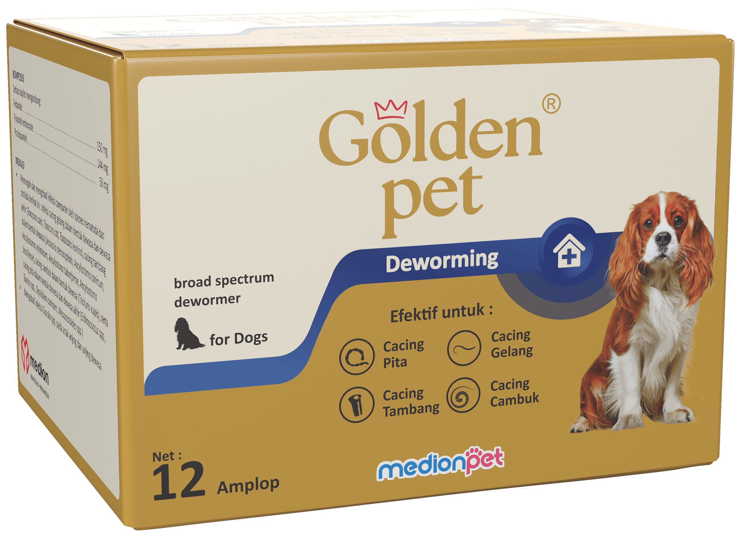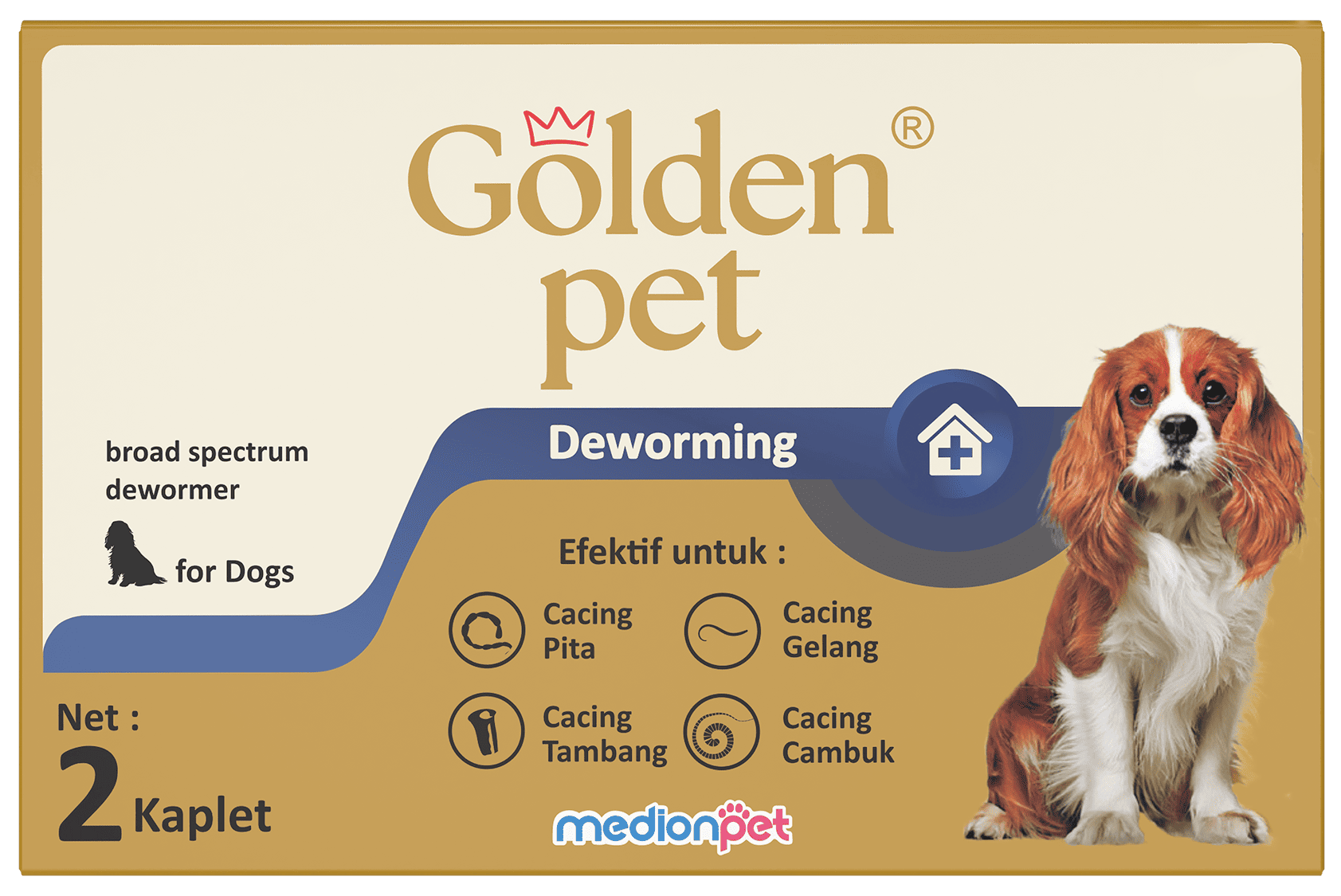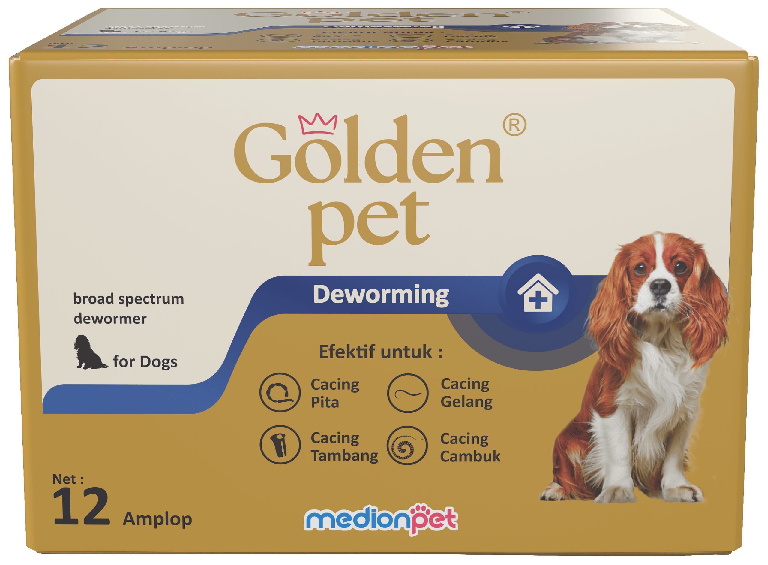 GOLDEN PET DEWORMING FOR DOGS is a caplet formulation containing a combination of febantel, pyrantel embonate, and praziquantel. Febantel works by binding to the parasite’s β-tubulin, inhibiting the polymerization of α- and β-tubulin subunits to form microtubules within the worm’s cells, leading to its death. Pyrantel embonate acts as a neuromuscular depolarizing blocker by promoting the release of acetylcholine, inhibiting cholinesterase, and stimulating ganglionic neurons, resulting in muscle contraction and paralysis. Praziquantel works by damaging the worm’s tegument and causing muscular contraction, which leads to paralysis and eventual death.