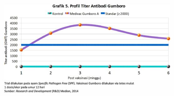 Selain berdasarkan antibodi maternal, juga perlu melihat sejarah kasus Gumboro pada periode pemeliharaan sebelumnya. Sebagai contoh, serangan terjadi di umur 21 hari, maka vaksinasi Gumboro dapat dilakukan paling lambat 2 minggu sebelum umur serangan penyakit yaitu pada umur 7 hari. Pada kasus Gumboro yang muncul pada ayam umur < 21 hari dengan tingkat kematian tinggi (> 5%), vaksin jenis intermediate plus atau Medivac Gumboro A menjadi solusi yang tepat. Dengan Medivac Gumboro A akan terjadi pembentukan kekebalan lebih cepat dan optimal (titer protektif terbentuk kurang dari 2 minggu dan bertahan hingga 6 minggu post vaksinasi) sehingga ayam terlindungi lebih awal dari serangan Gumboro (grafik 5). Namun jika kasus Gumboro yang muncul pada ayam umur > 21 hari dengan tingkat kematian rendah (< 5%), maka dapat menggunakan vaksin jenis intermediate atau Medivac Gumboro B.