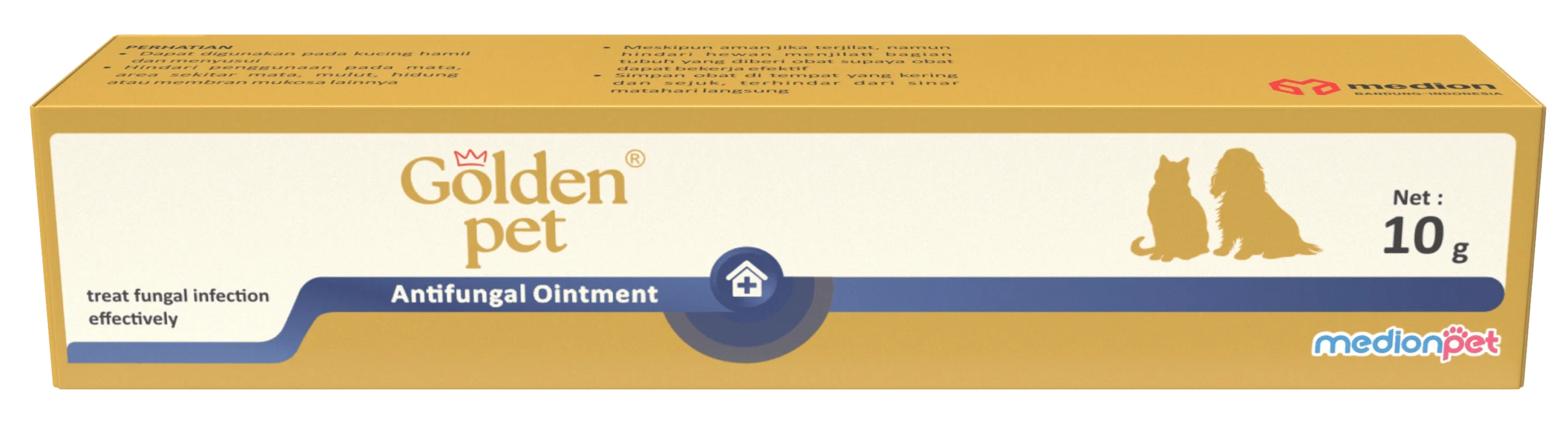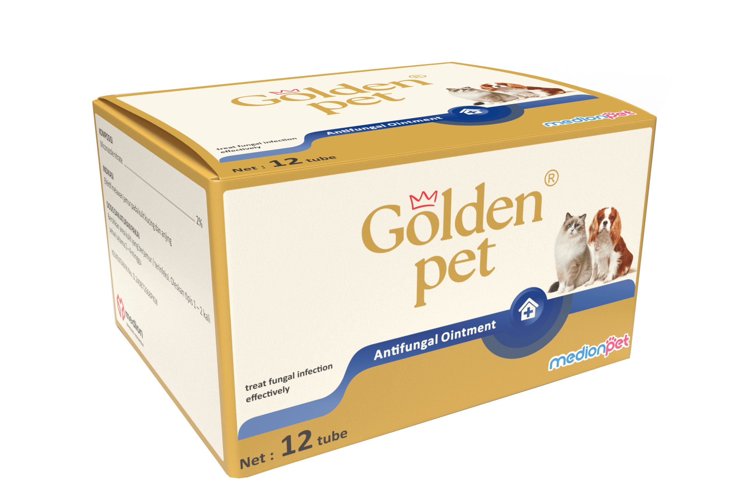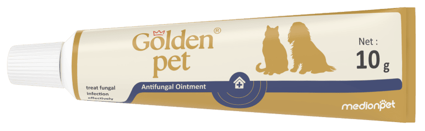 GOLDEN PET ANTIFUNGAL OINTMENT merupakan sediaan berbentuk salep mengandung miconazole nitrat yang berfungsi mengobati infeksi jamur pada kulit kucing dan anjing. Miconazole bekerja dengan cara menghambat kerja enzim P-450 yang berperan dalam pembentukkan membran sel pada jamur, sehingga berakibat pada kematian jamur.